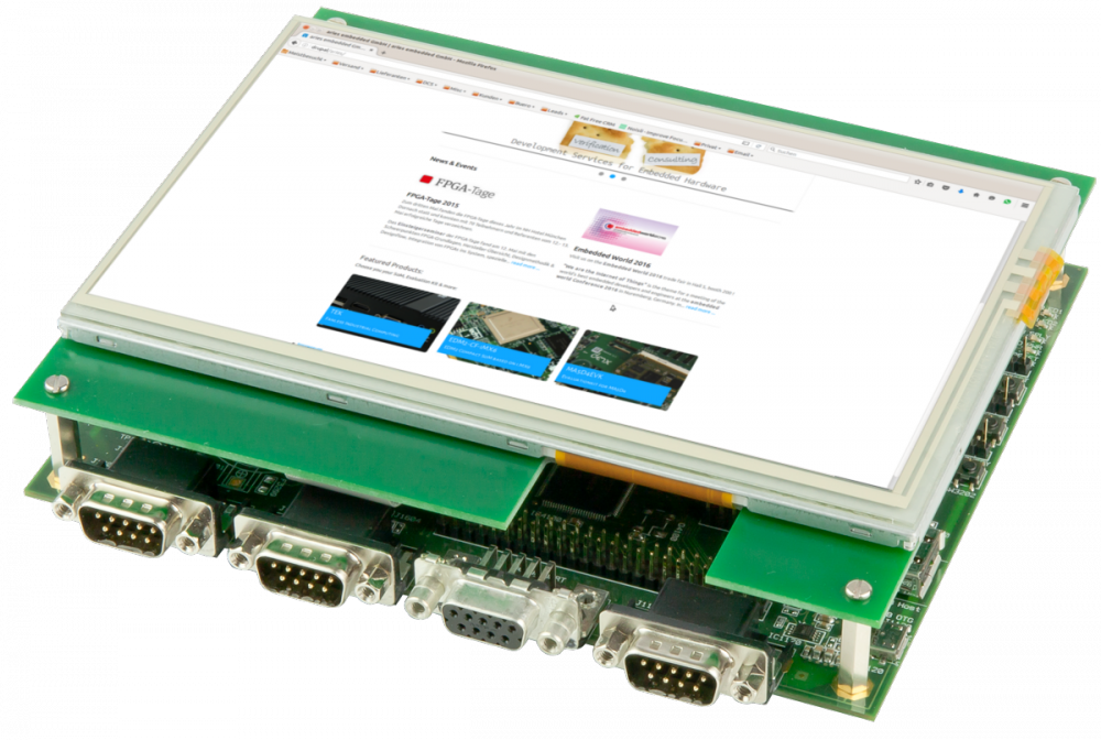 Due to the Plug'n Play concept and the completeness of the EVK it can be used either for evaluating the M28 SOM or setting up a prototype. The M28EVK is shipped as a complete kit including a 17,78cm (7'') TFT display with touch screen support and a USB wall plug.