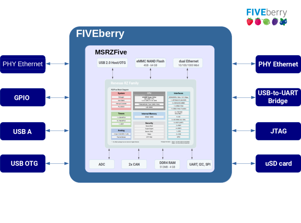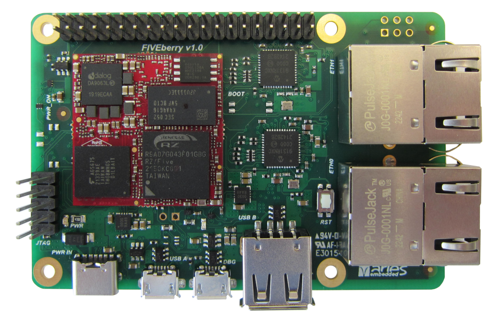 The FIVEberry baseboard is build around the MSRZFive System on Module. The FIVEberry supports users to have a smooth start-up with the new CPU architecture RZ/Five by Renesas. It supports all necessary features to make first steps with the RISC-V CPU core, develop and debug drivers and the bootloader and even to use it in prototype setups.