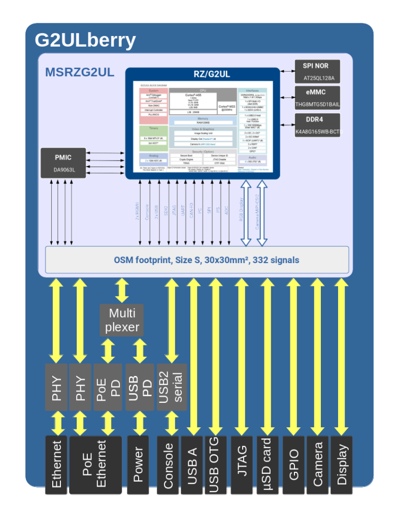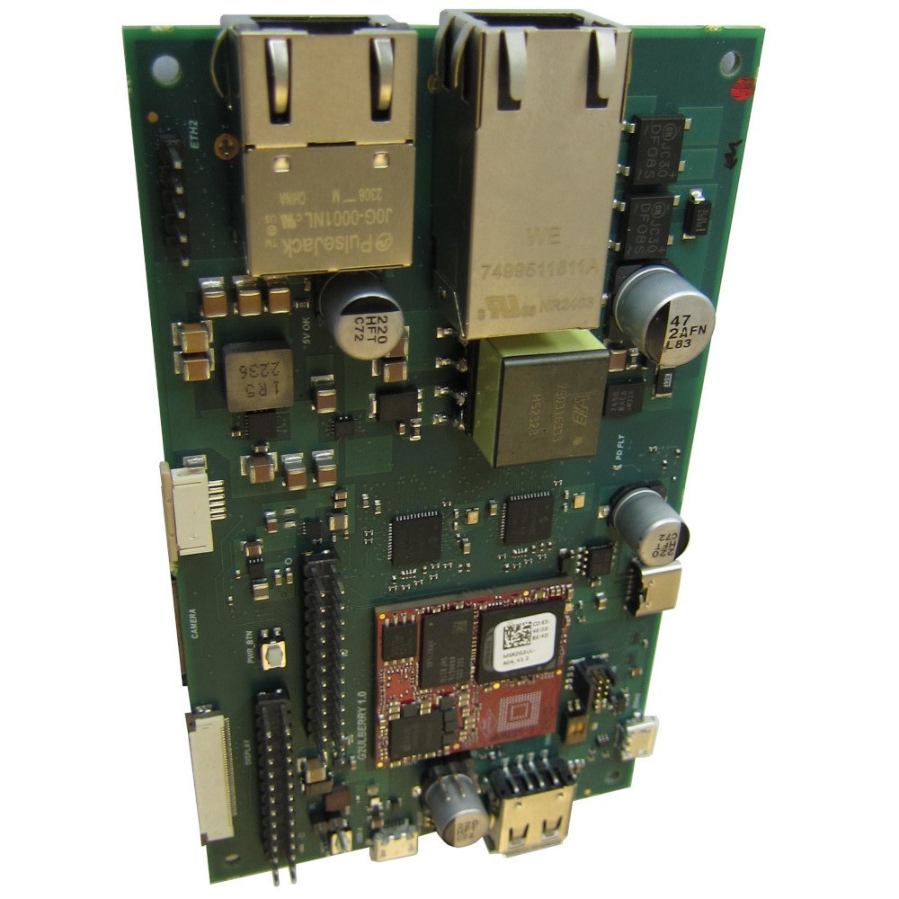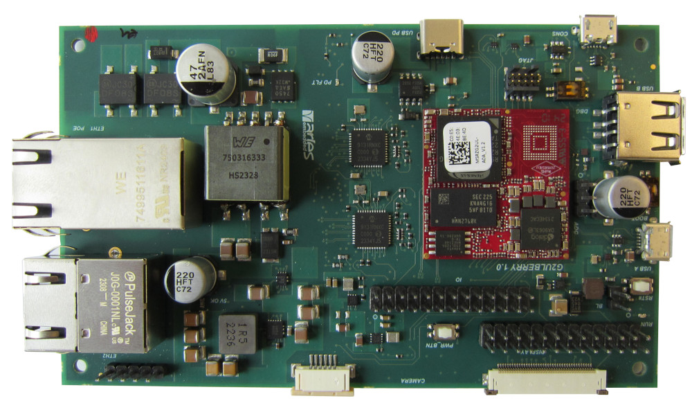 The G2ULberry baseboard is build around the MSRZG2UL System on Module. The G2ULberry supports users to have a smooth start-up with the new CPU architecture RZ/G2UL by Renesas. It supports all necessary features to make first steps with the CortexA55 CPU architecture, develop and debug drivers and the bootloader and even to use it in prototype setups.