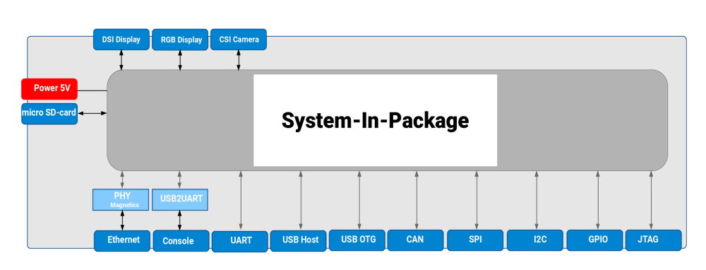 - SoM, hosting all memory and logic interfaces