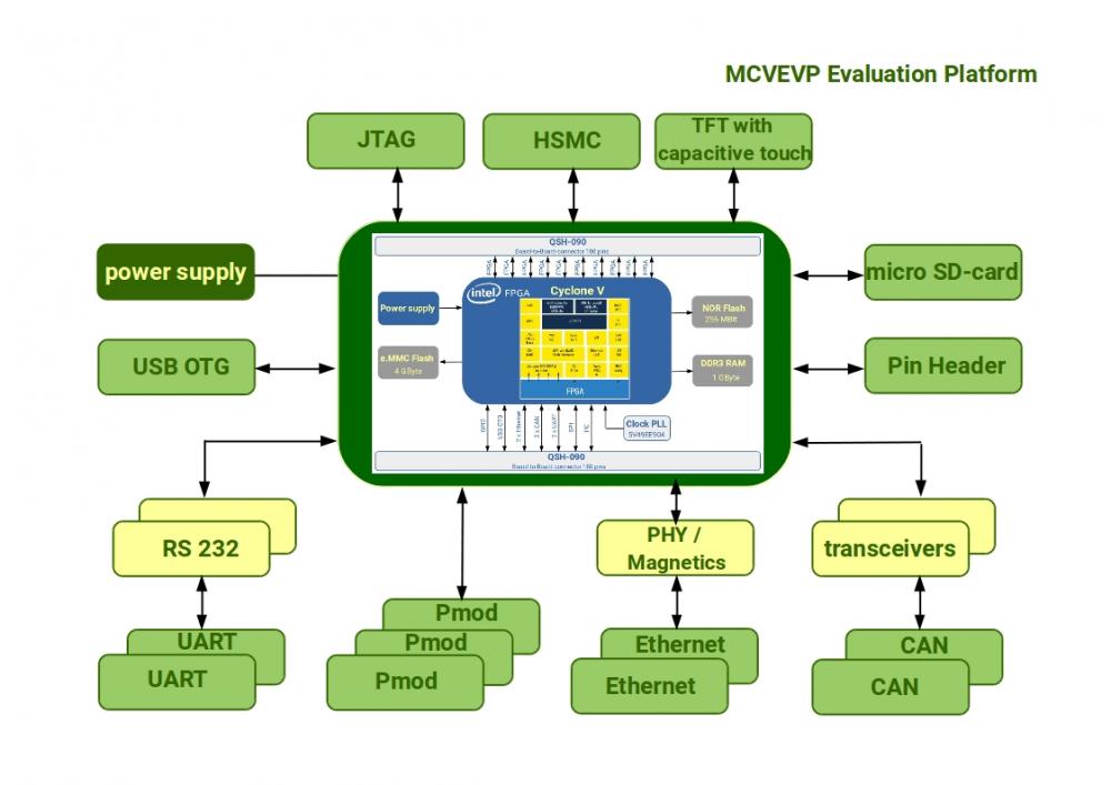 The MCVEVP supports a quick start-up of SoC-FPGA projects and can easily be used as a fast-prototype platform.
