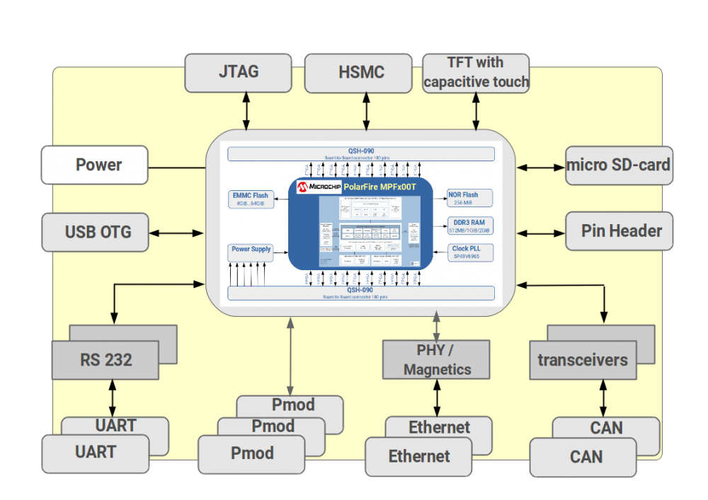 The M100PFEVP supports a quick start-up of FPGA projects and can easily be used as a fast-prototype platform.