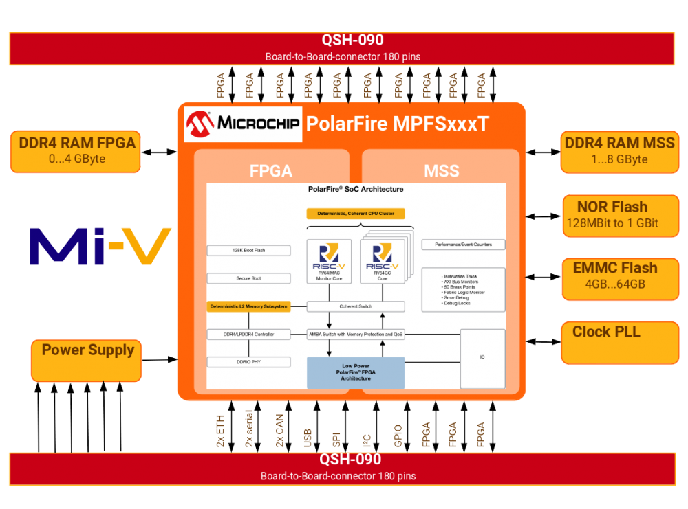 The M100PFS is based on the PolarFire SoC FPGA architecture by Microchip and combines high-performance 64-bit RISC-V cores with outstanding FPGA technology. The platform integrates a hardened real-time, Linux capable, RISC-V-based MPU subsystem on the mid-range PolarFire FPGA family, bringing low power consumption, thermal efficiency and defence grade security to embedded systems.