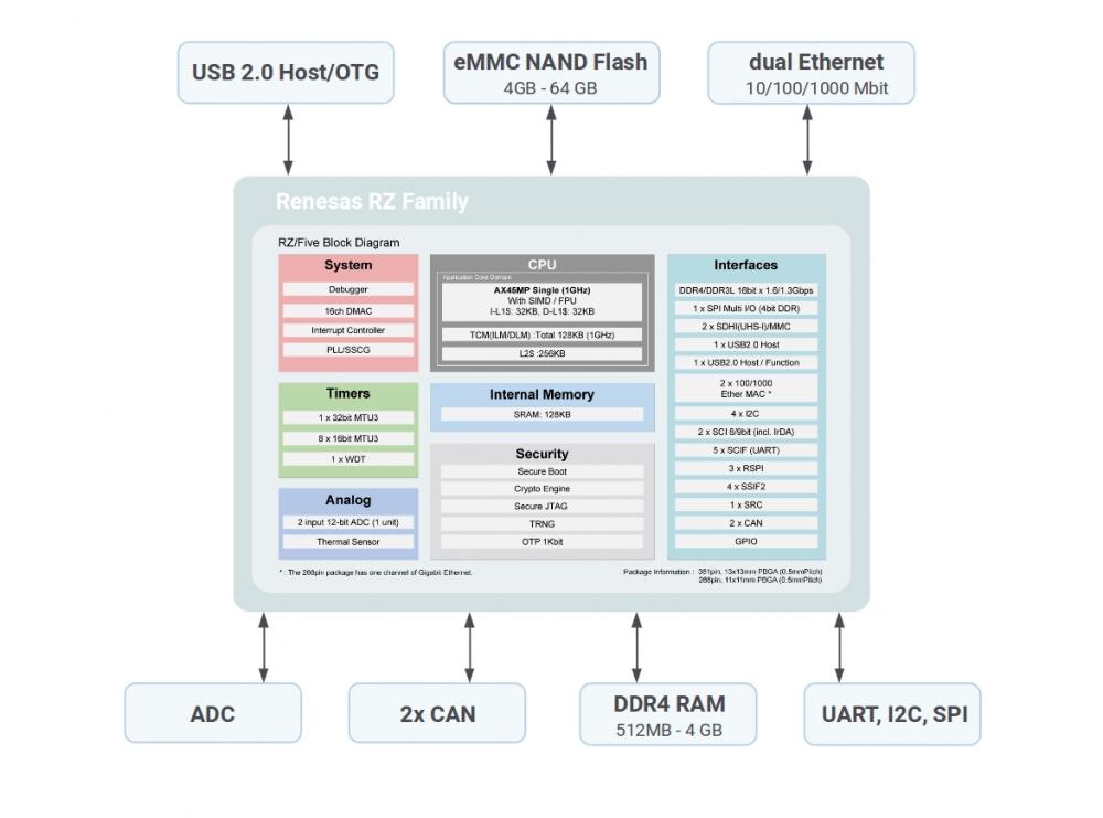 The RZ/Five general-purpose microprocessor units (MPUs) are built around a 64-bit RISC-V CPU core and employ the Andes AX45MP, based on the RISC-V CPU instruction set architecture (ISA). Peripheral functions include support for multiple interfaces, such as two Gigabit Ethernet channels, two USB 2.0 channels, and two CAN channels, as well as dual A/D converter modules, making it ideal for applications such as entry-class social infrastructure gateway control and industrial gateway control.