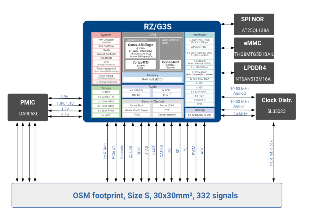 The MSRZG3S is the System-In-Package based on Renesas RZ/G3S Family architecture offering high-performance Cortex-A55/dual Cortex-M33 core. The MSRZG3S combines compact design and a wide range of services, bringing low power consumption, thermal efficiency and low-cost to embedded systems. The MSRZG3S was designed to meet the specification of the OSM-standard as much as possible.