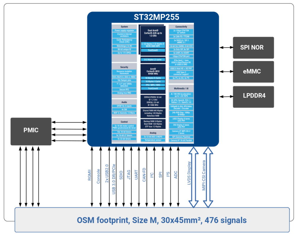The STM32MP2 general-purpose microprocessor units (MPUs) are built around two CortexA7 CPU cores. Peripheral functions include support for multiple interfaces, such as two Gigabit Ethernet interfaces, an USB3.0DRD interface, two USB 2.0 channels, and two CAN channels, as well as A/D converter modules, making it ideal for applications such as HMI devices, industrial control and gateway devices. The chosen OSM form factor supports 476 contacts, offers almost all of the CPU functionality on the contacts and is therefore suitable for most industrial applications.