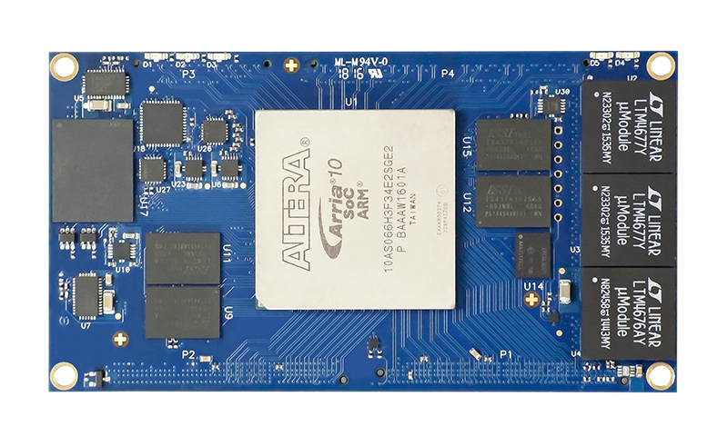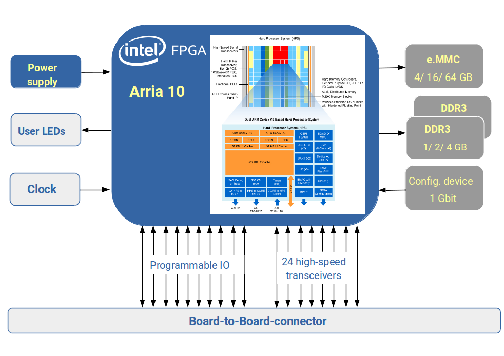 The MAX System on Module supports Intels® Arria® 10 FPGA family and provides the architecture on a very compact embedded board. The Arria 10 SoC-FPGA in F34 footprint (1152 pins) provides 23 transceivers with data rate up to 17.4 GBit/s, connected via Samtec high speed connectors to the baseboard. The MAX SoM can be populated optionally with 480KLE, 570KLE and 660KLE Arria 10 SoC-FPGAs.